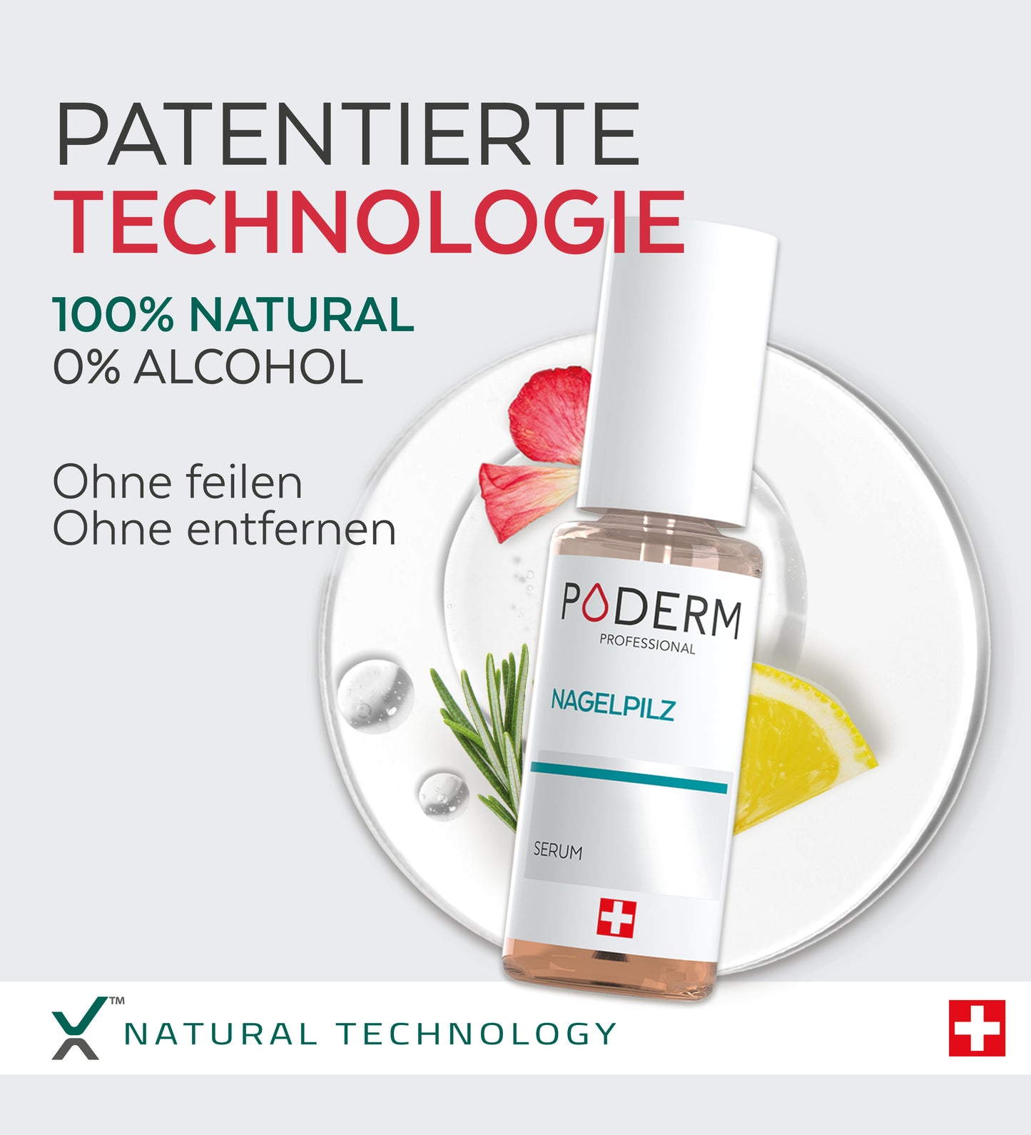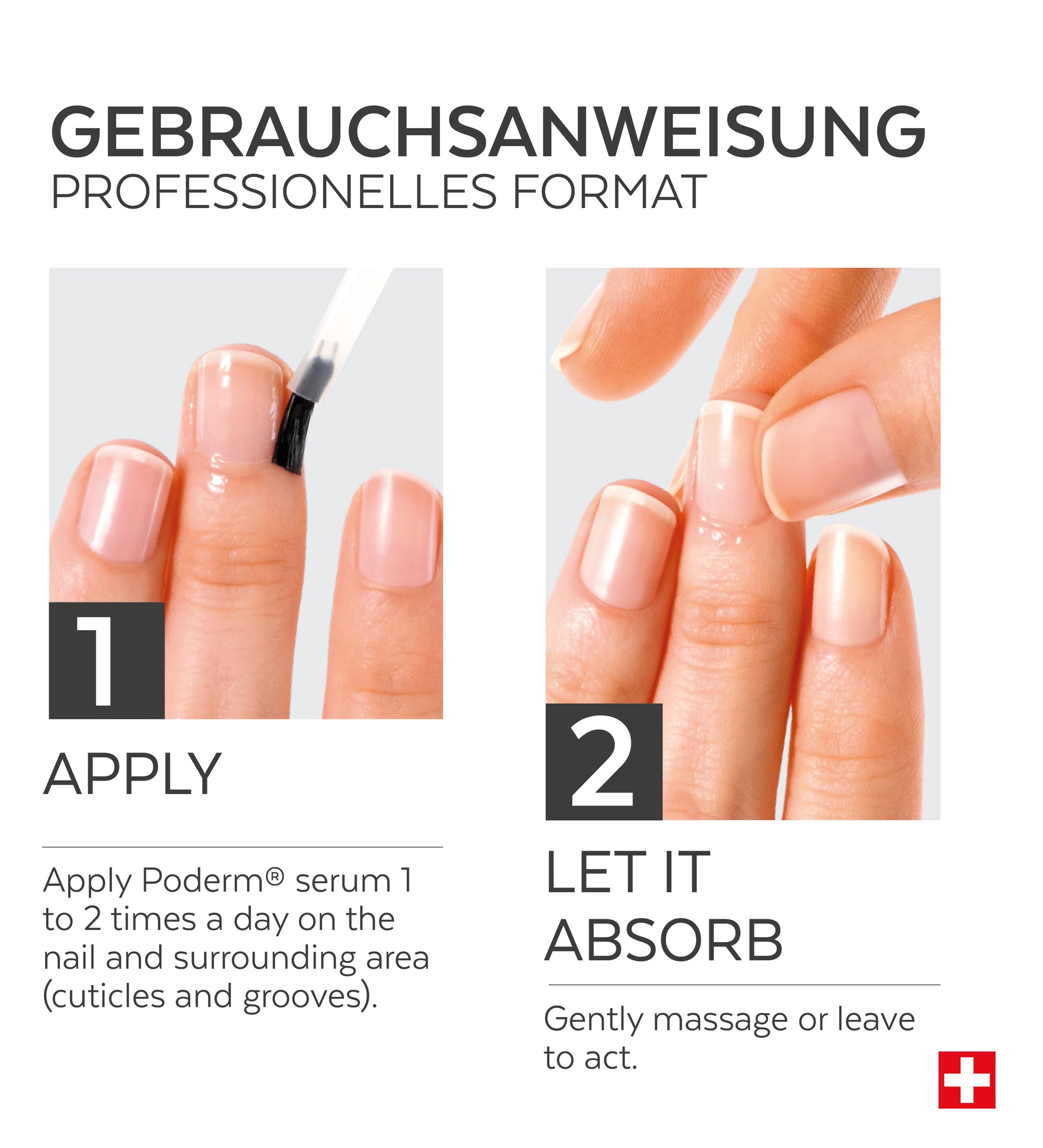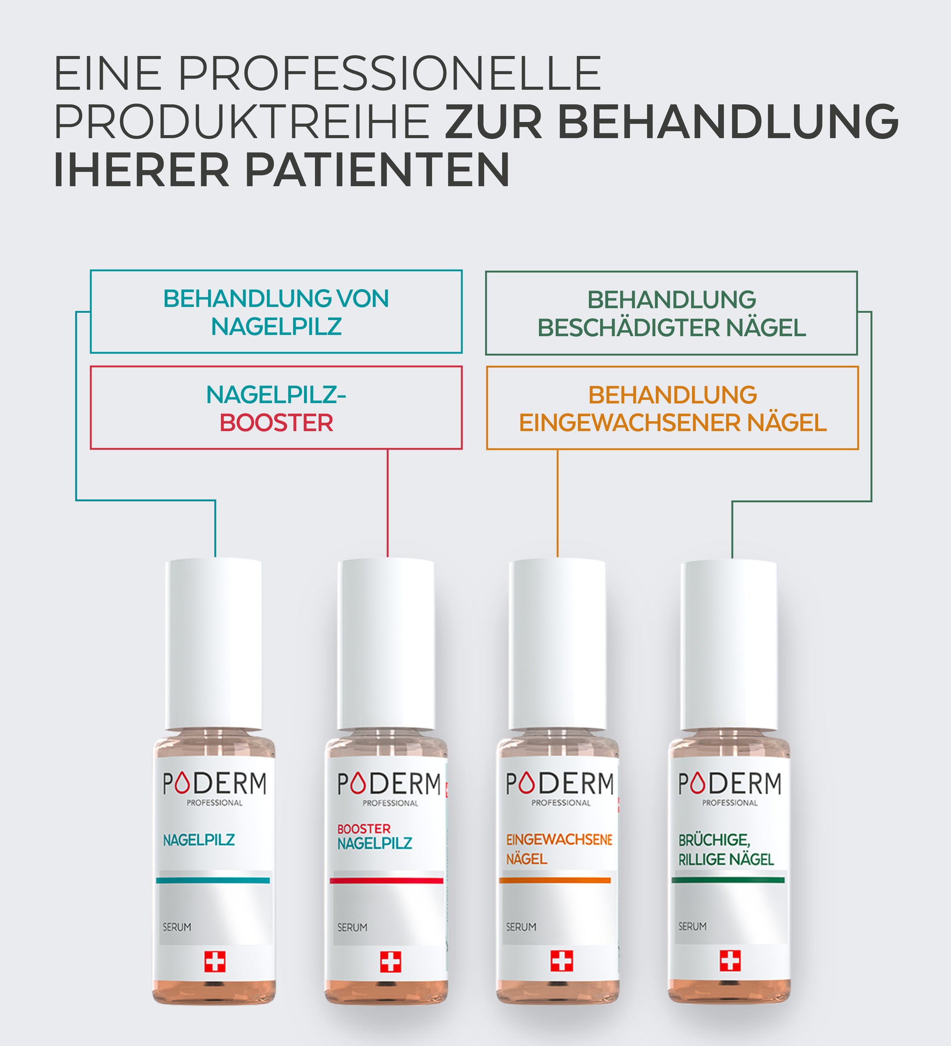 Das PODERM® Booster-Serum – Nagelpilz, das ausschließlich in Kombination mit dem PODERM® Nagelpilz-Serum verwendet wird, um die Behandlung zu beschleunigen und den Reparaturprozess von durch Pilzbefall gelblich und geschädigten Nägeln zu aktivieren. Intensive Regeneration. Speziell für hartnäckige oder wiederkehrende Pilzinfektionen. 2x pro Woche – nur in Kombination mit dem PODERM® Nagelpilz-Serum anwenden.